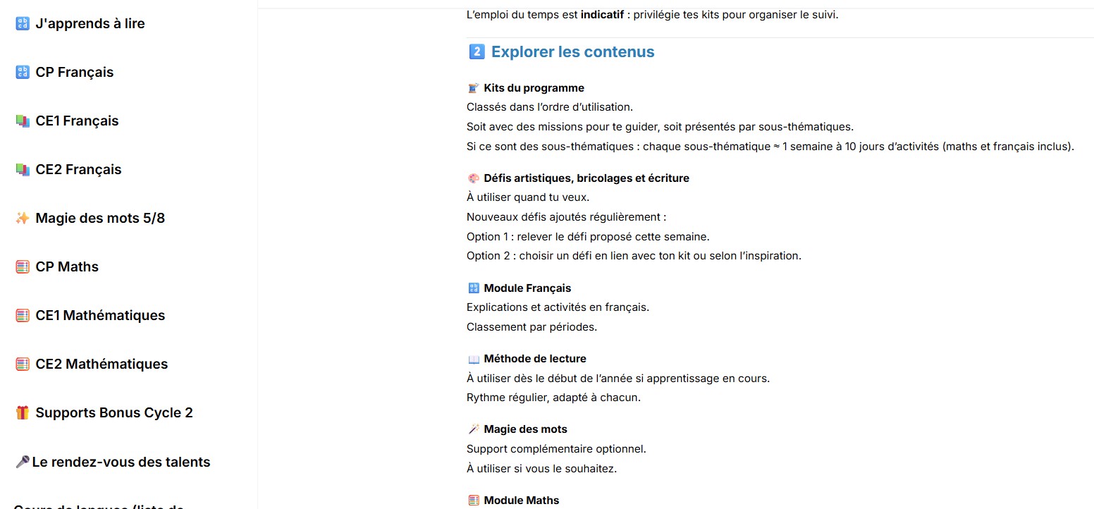 Notre programme est notamment basé sur la pédagogie de projet, avec un fil conducteur immersif et des personnages enfants. L'approche alterne jeux, mises en situation concrètes et apprentissages formels. Chaque thème aborde les fondamentaux (maths, français, etc.) de manière cohérente et stimulante.